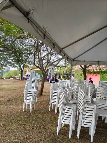 Mesas e cadeiras de plástico para festas